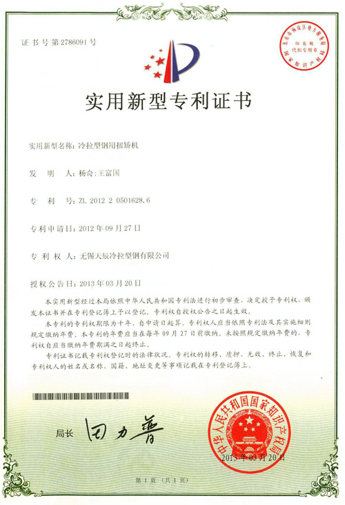 冷拉型钢盘圆料矫直剪切装置实用新型专利证书
